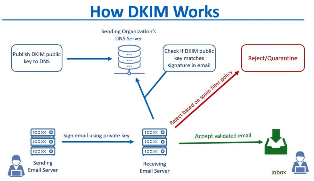 - DKIM: DomainKeys Identified Mail, werkt – simpel uitgelegd – als de digitale handtekening van je e-mail.
