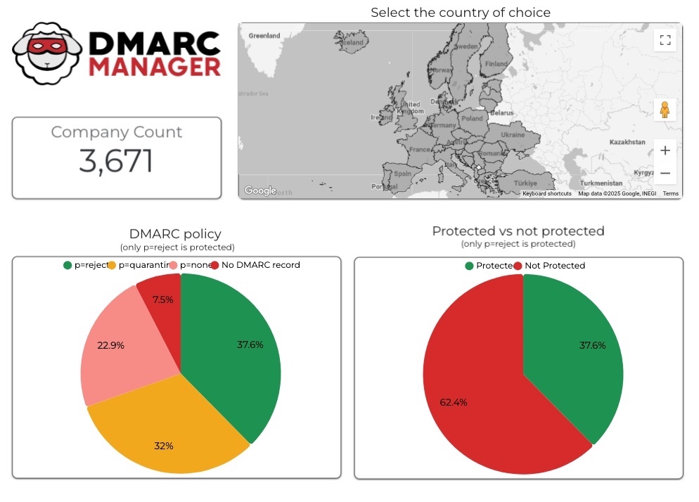 Dmarc Advisor biedt een fraai visueel overzicht, waarin per land kan worden bekeken in hoeverre bedrijven al dan niet ‘beschermd’ zijn. Zie onderstaamd overzicht op basis van 3671 bedrijven.